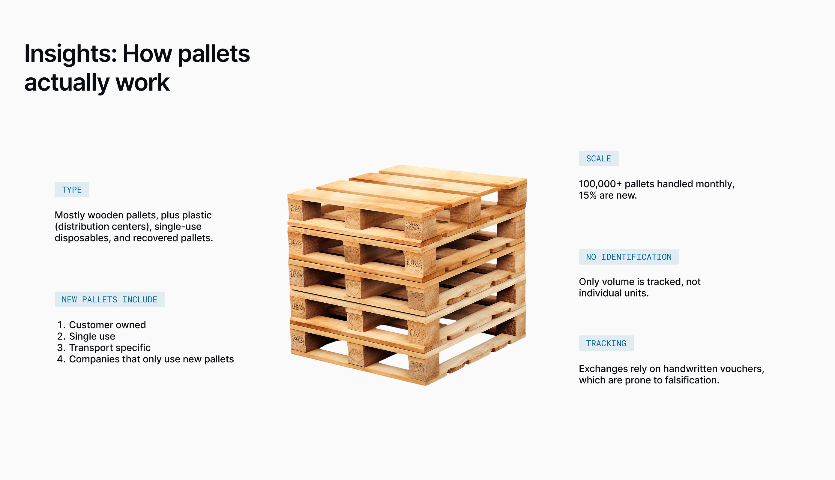 The platform shipped at the start of 2020 and generated estimated savings of over $100,000 USD per month — more than $1.2M annually — by eliminating losses from missing pallets, disputed debts, and manual errors.
